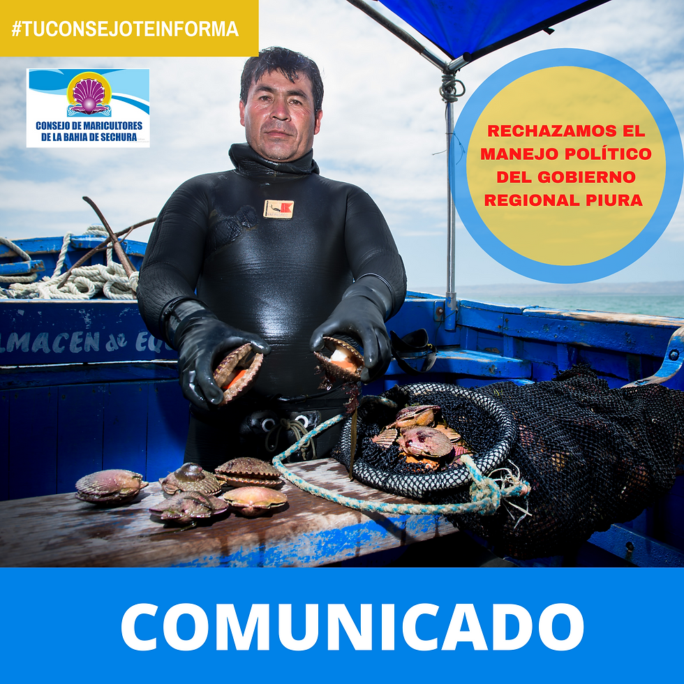 El CONSEJO DE MARICULTORES, institución reconocida con Ordenanza Regional N° 350-2016/GRP-CR, cuya función es la de representación de manera única de las zonas de producción acuícola de la bahía de Sechura, y que representa a las organizaciones sociales de pescadores artesanales que se dedican a la maricultura de moluscos bivalvos en la bahía de Sechura, expresamos a toda la comunidad pesquera y acuícola de la bahía de Sechura y a la población en general lo siguiente: