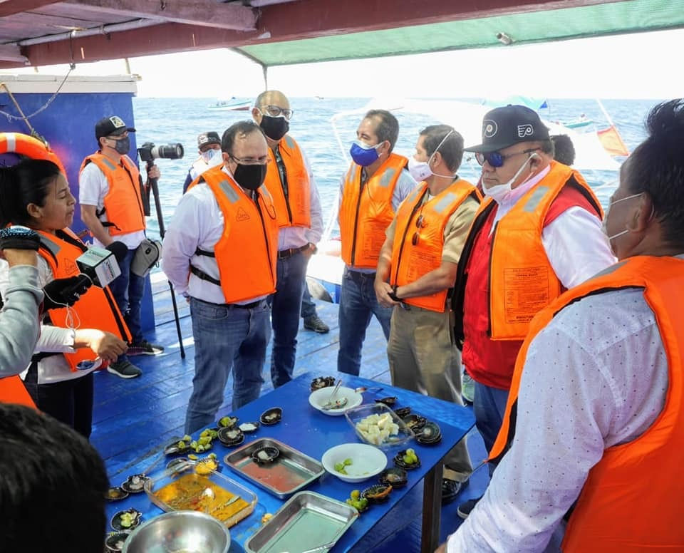El titular de la cartera de la Producción llegó en compañía de la congresista por Piura, María Luisa Silupú, y el jefe del Fondepes Alvaro Reinoso. Durante el recorrido la delegación visitó el área de producción de Barrancos y degustó del gran manjar sechurano (concha de abanico) en alta mar.